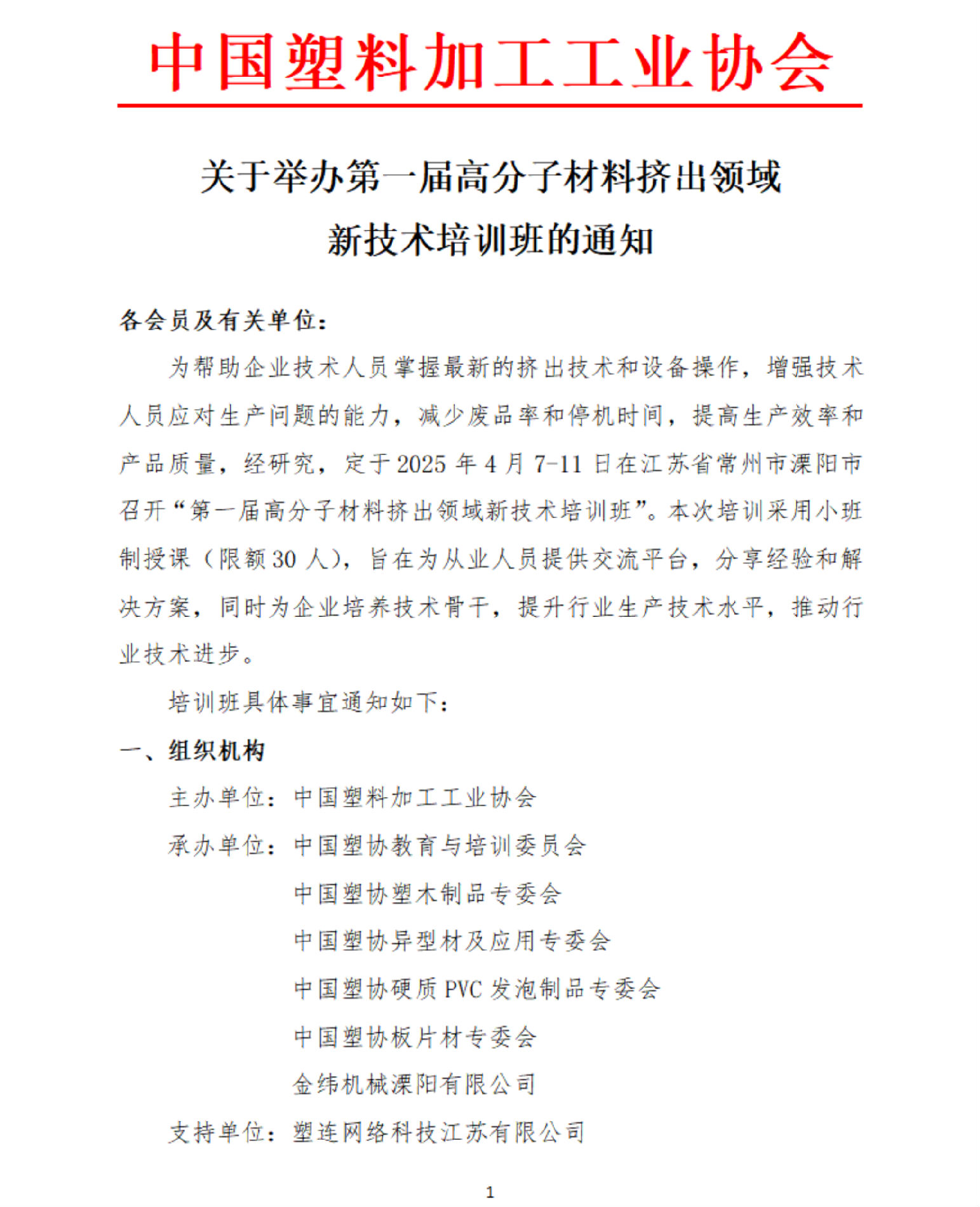 关于举办第一届高分子材料挤出领域 新技术培训班的通知